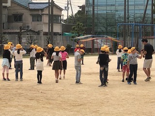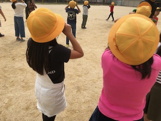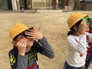 遮光板(太陽めがね)を使って太陽の観測をしています。担任からは直接太陽を見ないように注意が繰り返されています。