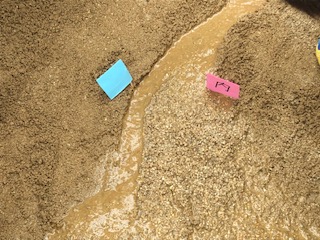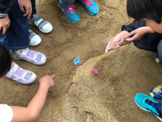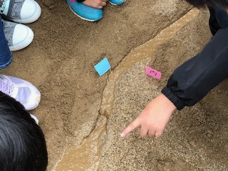川の外側と内側での削れ方の違いを旗を立てて確かめています。違いがとてもよくわかる実験となりました。