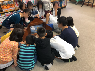 1年生と6年生が同じ時間に学校図書館を利用しました。学校図書館補助員の方が読まれる紙芝居もいっしょに仲良く見ています。