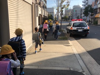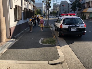 横断歩道に警察官の方が立ってくださいました。赤色灯をつけたパトカーも止まっています。