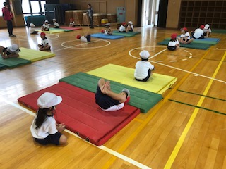 マットを敷いて体育をしています。うまく転がっています。