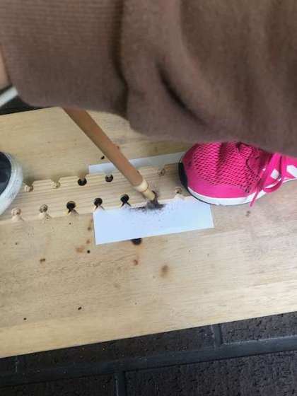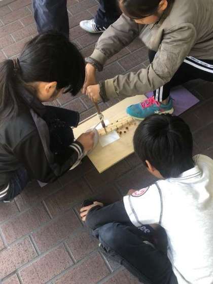 二人で協力して火を起こします。火種がついたら手で風を送ります。