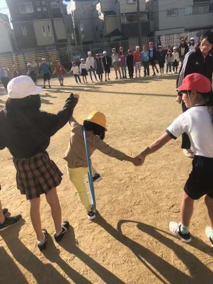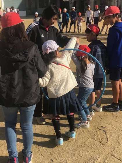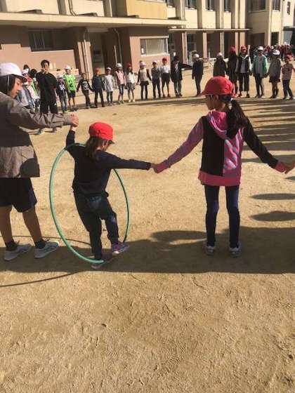 今朝は集会委員会が司会で児童集会をしました。たてわり班で大きな円をつくり、手をつなぎます。手をはなさないで、フラフープをとなりの人へと渡していきます。上手にくぐれるかな?みんな協力して、ゲームを楽しんでいました。