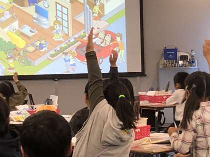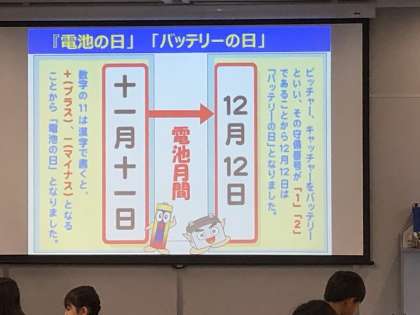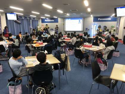 11月6日にパナソニックの電池工場の見学にいきました。スタッフから工場の説明を聞いています。