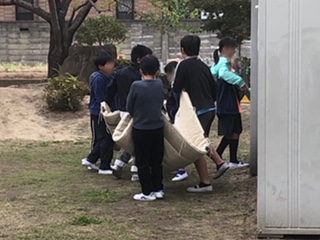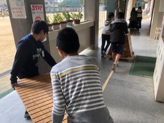作品展が近づいてきました。5年生が会場の準備をしています。体育の用具を片付けています。