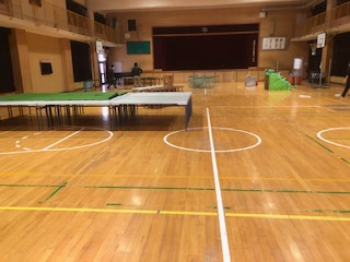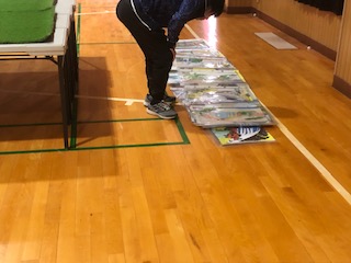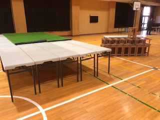 作品展の会場準備を始めました。絵は透明なシートに入れて、工作などを置く台を設置していきます。