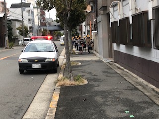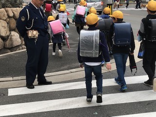 警察官が横断歩道に立って子どもたちを見守ってくださっています。