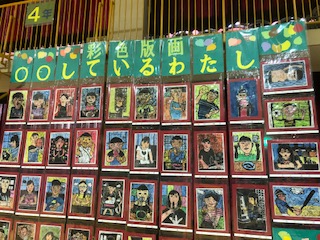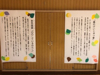 4年生は彩色版画・◯◯しているわたし、工作・森のげいじゅつ家です。彩色版画の裏には黒色の版画も展示されています。版画展示の裏側もご覧ください。