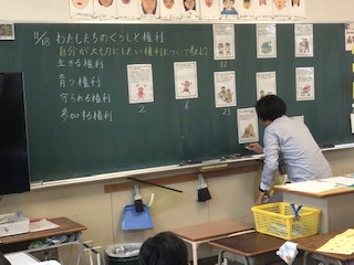 「子どもとともに生活を見つめ直し、安全・安心を築く生活指導」〜わたしたちのくらしと権利〜の主題で学習を進めました。子どもの権利条約の資料を活用しています。