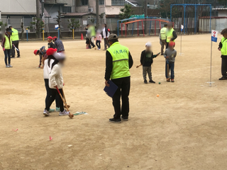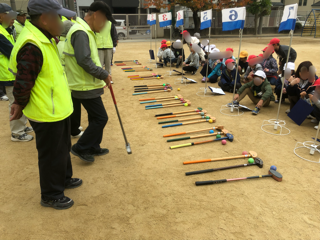 地域の方が来られてグランドゴルフを教えてくださいました。まず2年生があいさつの後にルール説明を受けて、体験活動を始めました。