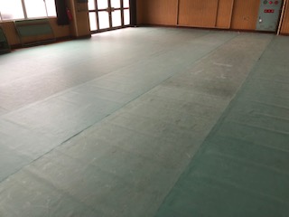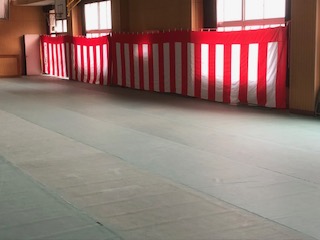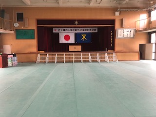 40周年記念式典の会場・講堂にはシートが敷かれて紅白幕も張られました。舞台上も整えられました。
