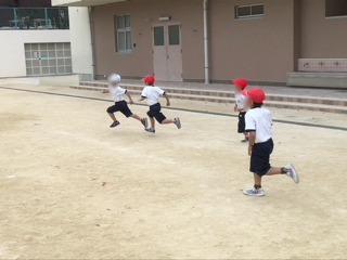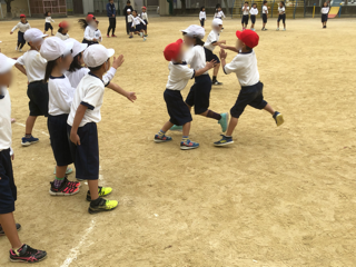 チームに分かれてゲームをしています。つかまった仲間を助けたり、相手チームの子を追いかけたりして活発に運動しています。