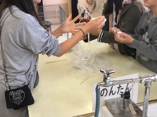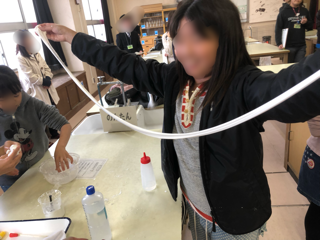 材料の分量などをグループで相談しながらオリジナルのスライムを作っていきます。伸びるスライムを作ろうと考えていたグループは思った通りのスライムを完成させました。