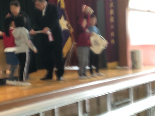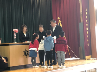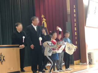 記念式典事業委員長より記念品の数々が児童代表の1年生に順に手渡されました。頭の上にかかげて喜び児童もいました。