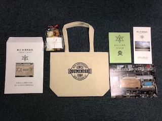記念の児童集会で子どもたちが受け取った記念の品々です。この後に教室で全児童に配られました。