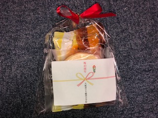 記念の品です。1.手提げバッグ、2.航空写真が印刷された封筒、3.お菓子です。