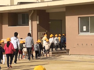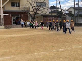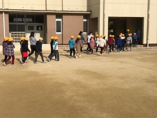 津波が来ることを想定して3階以上に避難します。運動場から校舎に戻ります。