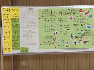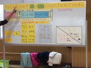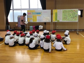 大阪市教育研究会の授業研究会を1年生 のクラスで行いました。「ぜんしんをつかってむしやきようりゅうになりきってなかよくおどろう」をテーマに授業を進めました。はじめに今日の内容を聞きます。