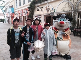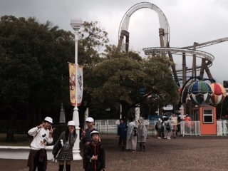 志摩スペイン村で遊んでいます。天気はちょっと残念、小雨が降ったり止んだりしています。でも、みんなは、小雨模様へっちゃらで遊びまくっています。