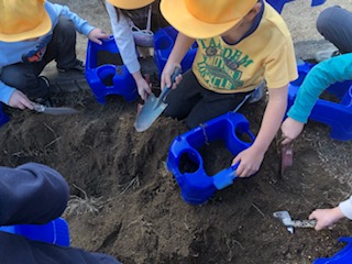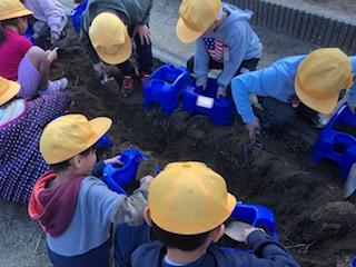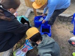 1年生がチューリップの球根を植えました。まず、鉢に土を入れていきます。堆肥と肥料も混ぜます。