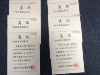 読書感想文コンクールで、学校図書館協議会賞を受賞した子どもたちに賞状が手渡されました。これからもたくさん本を読んで、感想文にもチャレンジしていく励みとなりました。