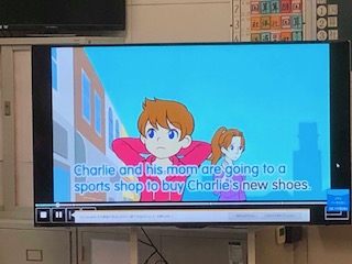 朝の英語タイムでは担任が英語で進めながら画面に映る英語を聞き取っていきます。