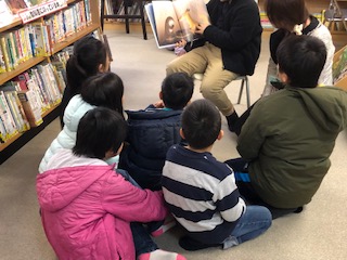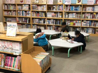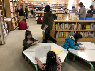 今日は雨でした。教職員が学校図書館を開放するとたくさんの子どもたちが来館しました。本の読み聞かせをする児童もいました。