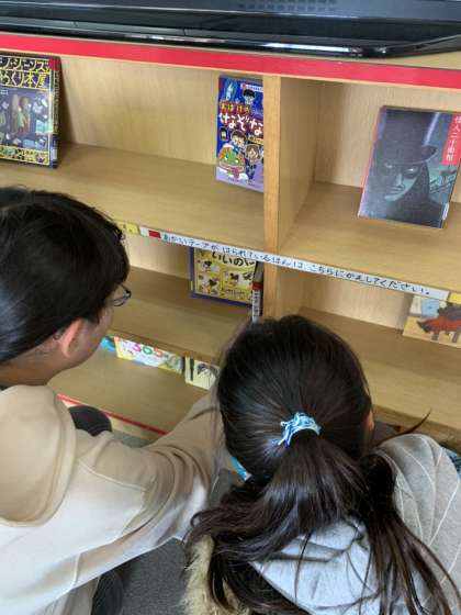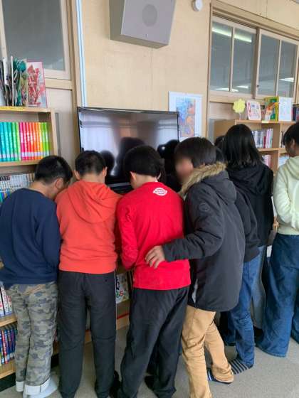 今日は新刊図書の日で昼休みに貸し出しが始まり、待ちかねていた子どもたちが新刊図書の棚に集まりました。新刊図書は次々に貸し出されていき、棚から本がなくなりました。