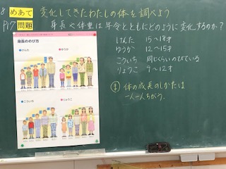 保健の授業も行っています。今日は身長や体重が年齢とともにどのように変化するのかを学習しました。その変化が一人一人違うことも学びました。