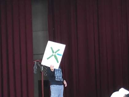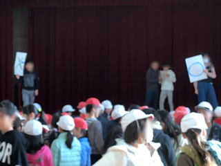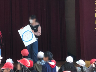今日の児童集会は先生に関する◯Xクイズでした。A先生はコーヒーが好きである、◯かXか。校長先生は60歳である、◯かXかなどの問題がありました。