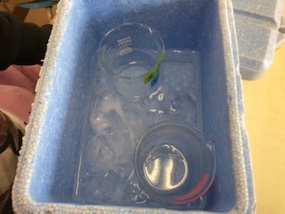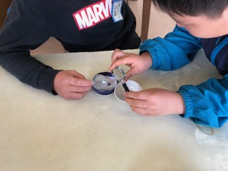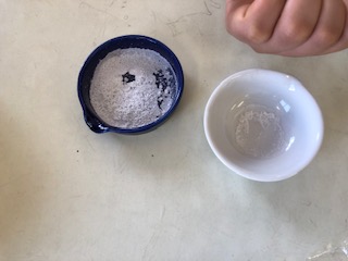 蒸発皿でコンロにかけると溶けていた食塩やミョウバンが出てきました。そのつぶの様子を虫めがねで観察しています。