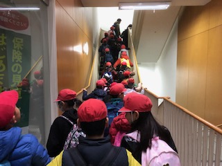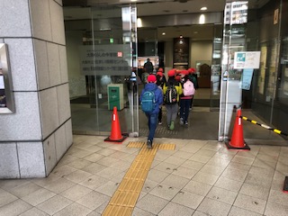 3年生の社会見学はくらしの今昔館です。到着してホールでお弁当を食べてから昔の道具などについての体験学習を行いました。(ホール内は撮影禁止となっていました)