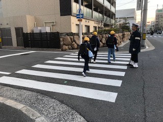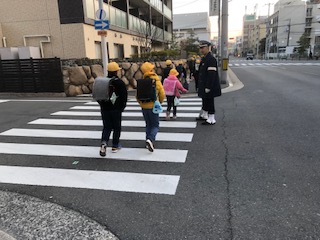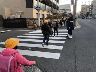 暖冬が続いていますが、朝はやはり寒くなっています。今日も警察官の方が立ってくださいました。