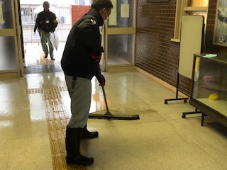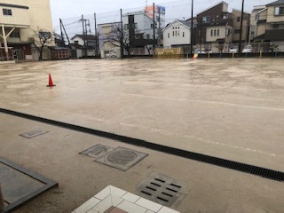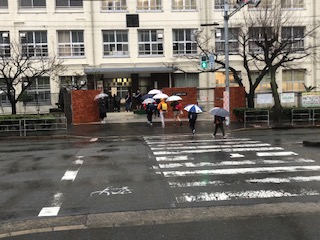 傘をさしての登校となり、玄関では管理作業員がたまった水をかき出しています。運動場には赤いコーンが置かれて、使用できないことを子どもたちに知らせています。