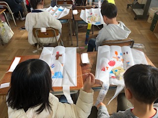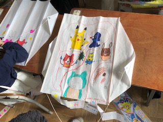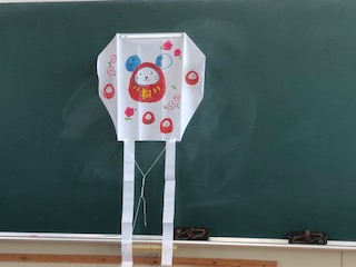 たこ作りに挑戦しています。糸を結ぶのがむずかしいようで、「先生、助けて」の声が教室で飛び交っています。担任も忙しく動き回っていました。