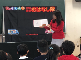 多目的室に移動して担当の方が読み聞かせをしてくださいました。子どもたちはしっかりと聞いていましたのでほめていただきました。
