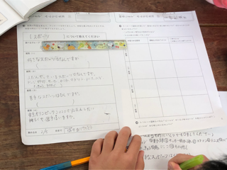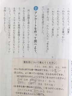 (教科書のページには、アンケートの例が載っています。2はんとかかれた名前は教科書の例に書かれているものです)