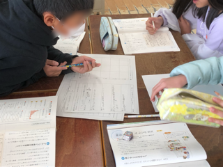 国語ではアンケートを使って調べる学習をしています。班ごとに調べることやアンケートの内容を話し合っています。