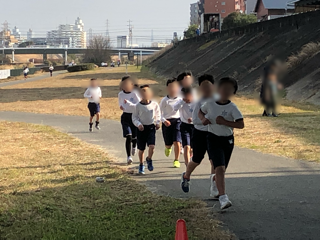 神崎川の河川敷で4年生、5年生、6年生の持久走大会を行いました。4年生は2200mを走ります。折り返し地点での様子です。