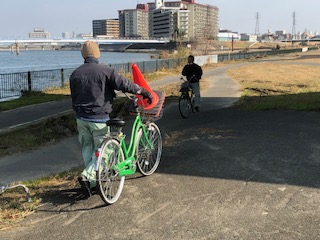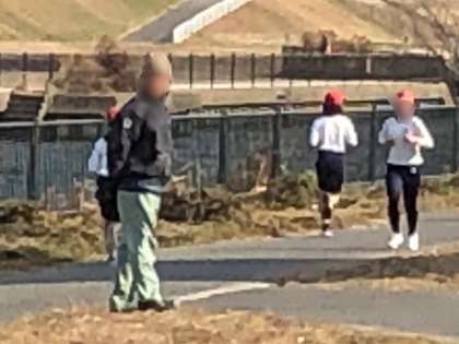 持久走大会では、安全確保のため、管理作業員もポイントに立ったり自転車で巡回したりしています。折り返し地点のコーンも学校から運んでいます。