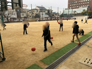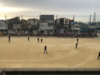 冷え込みの厳しかった今朝の校庭です。運動場でも中庭でも、子どもたちは玄関掲示のように寒さに負けずとびはねています。