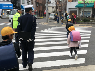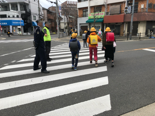 交差点に警察官や地域の方が立っておられました。子どもたちもあいさつをしていました。教職員も自転車で巡回して見守りを行っています。