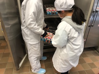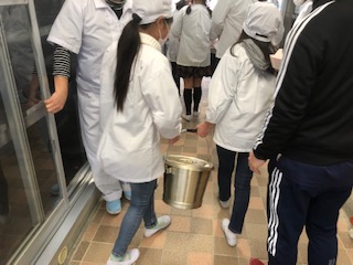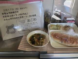 給食室には今日の献立が置かれています。給食当番の子どもたちが取りに行って、給食調理員さんが子どもたちに手渡しています。