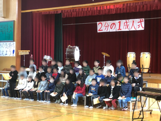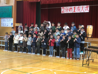4年生は2分の1成人式です。感謝の言葉を一人一人読み上げ、歌、リコーダー、合奏、群読などを行いました。