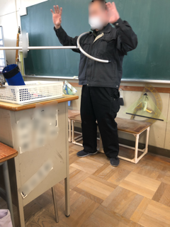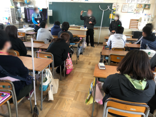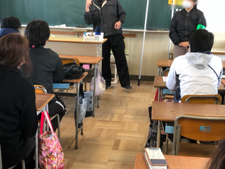 不審者対応の実地訓練のあとに警察官の方から通報の仕方、負傷者への対応、身の守り方などの講話をお聞きしました。さすまたの使い方も教えていただきました。