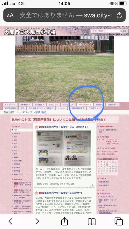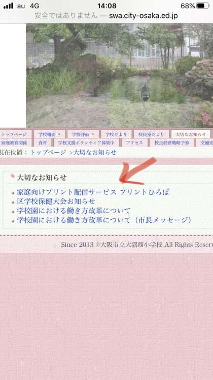 2.この「大切なお知らせ」の中の「家庭向けプリント配信サービス プリントひろば」をクリックします。