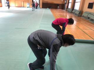 教職員全員が卒業式の会場準備を行いました。シートを敷き、ひな壇も作られていきます。
