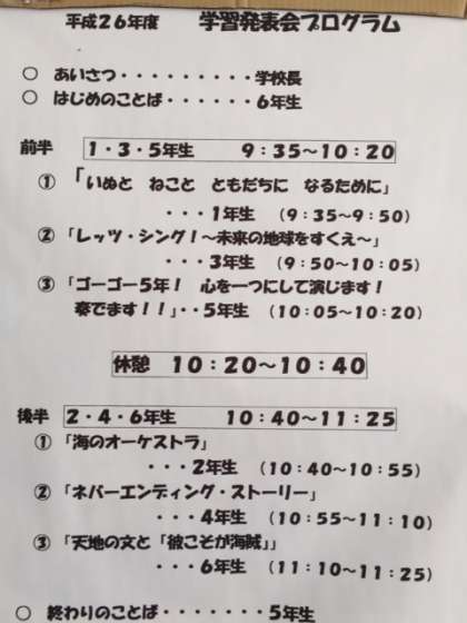 おはようございます。今日は学習発表会です。開門は9:10です。ぜひお越しください。