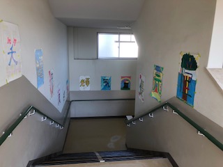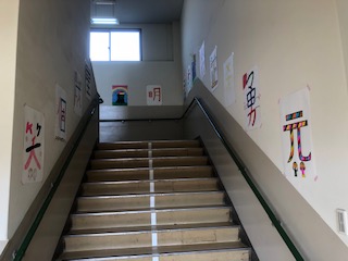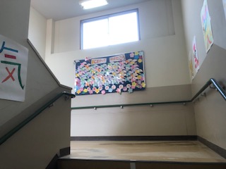 卒業式の日に卒業生が使う階段には卒業生一人一人の名前を書いた掲示や5年生が作った文字などが貼られています。
