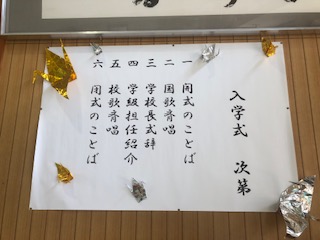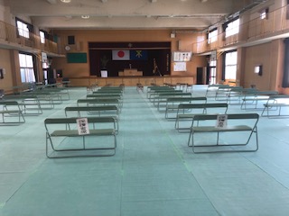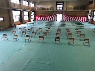 明日の入学式の会場が整いました。密集を避けるため、新入生も保護者の方々も間隔をあけて座っていただきます。保護者席は1家族一つの長椅子となっております。来賓祝辞や在校生の演技もなく、簡素な式の内容となっております。